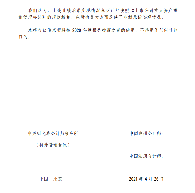 资料显示,中兴财光华会计师事务所(特殊普通合伙)(以下简称:中兴财光华)对*ST京蓝2020年财报出具了无保留意见的审计报告,并出具了业绩承诺专项审核报告。