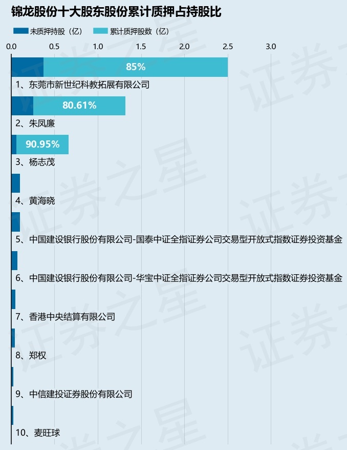 截止本公告日,股东东莞市新世纪科教拓展有限公司已累计质押股份2.12亿股,占其持股总数的85.0%,股东朱凤廉已累计质押股份1.06亿股,占其持股总数的80.61%,股东杨志茂已累计质押股份6030.0万股,占其持股总数的90.95%。本次质押后锦龙股份十大股东的累计质押股份占持股比例见下图: