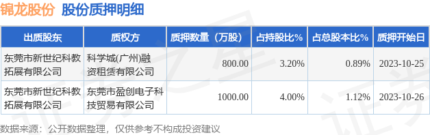 证券之星消息,锦龙股份(000712)10月27日公开信息显示,股东东莞市新世纪科教拓展有限公司向科学城(广州)融资租赁有限公司、东莞市盈创电子科技贸易有限公司合计质押1800.0万股,占总股本2.01%。质押详情见下表: