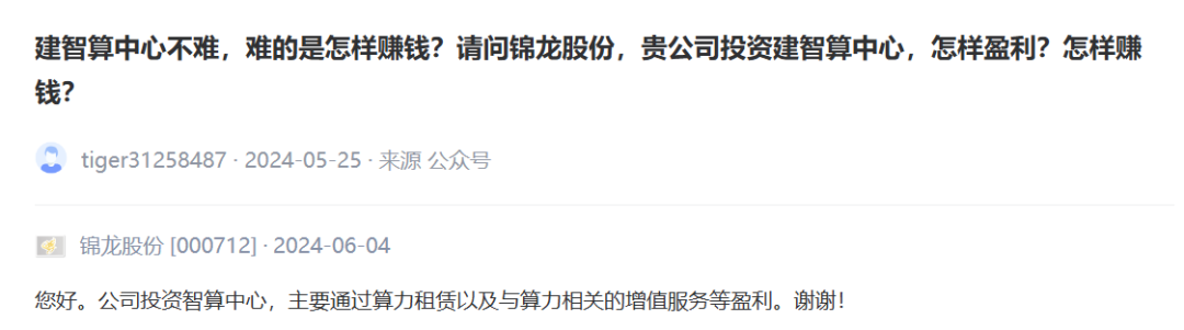 再看锦龙股份,缺乏相关领域积累,技术、人才等核心资源禀赋,无疑给此番跨界平添诸多不确定性。互动平台上就有投资者提出疑问“建智算中心不难,难的是怎样赚钱?请问锦龙股份,贵公司投资建智算中心,怎样盈利?怎样赚钱?”锦龙股份仅笼统回复称“公司投资智算中心,主要通过算力租赁以及与算力相关的增值服务等盈利。”