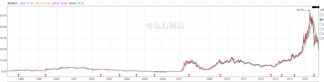 股价一向是业绩晴雨表。自1997年上市以来,锦龙股份股价大多不温不火,直到2007年收购东莞证券后一改前态、开始整体上行。2013-2015年更是直线大涨,一度触及2015年4月13日高点54.76元,较2012年末4.99元累涨997.39%,杨志茂夫妇也因此身价暴增,以净资产14亿美元跻身“东莞首富”,并登上“福布斯全球亿万富豪榜”位列237位。