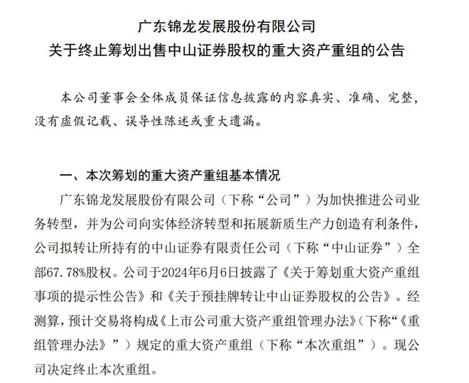 不过,为防止公司在出售中山证券股权后可能出现主要资产为现金或者无具体经营业务的情形,锦龙股份决定终止本次重组。