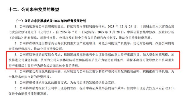 值得注意的是,早在2024年财报中,锦龙股份在“公司未来发展的展望”中就曾表示,“公司将以审慎的态度综合考虑、视情况统筹推进出售中山证券股权的重大资产重组项目,加大资金回笼规模,加快推进公司业务转型,从而为公司向实体经济转型和拓展新质生产力创造有利条件,确保不出现可能导致上市公司重大资产重组后主要资产为现金或者无具体业务的情形。”