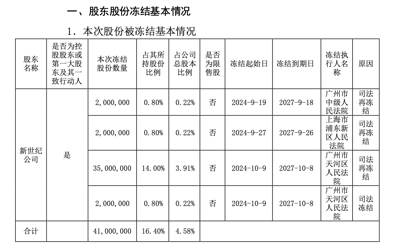其一是“中信金融资产”项下融资未清偿。新世纪公司曾与中国中信金融资产管理股份有限公司广东分公司就相关融资办理具有强制执行效力的公证债权文书;杨志茂等为融资保证人,最终因未如期清偿,由此引发了2-4月和7-8月的两次拍卖。值得一提的是,早在2024年10月28日,公司就曾发布公告,广州市中级人民法院、上海市浦东新区人民法院、广州市天河区人民法院共冻结了新世纪公司4100万股,其中就包括前两次拍卖中新世纪公司所持股份。
