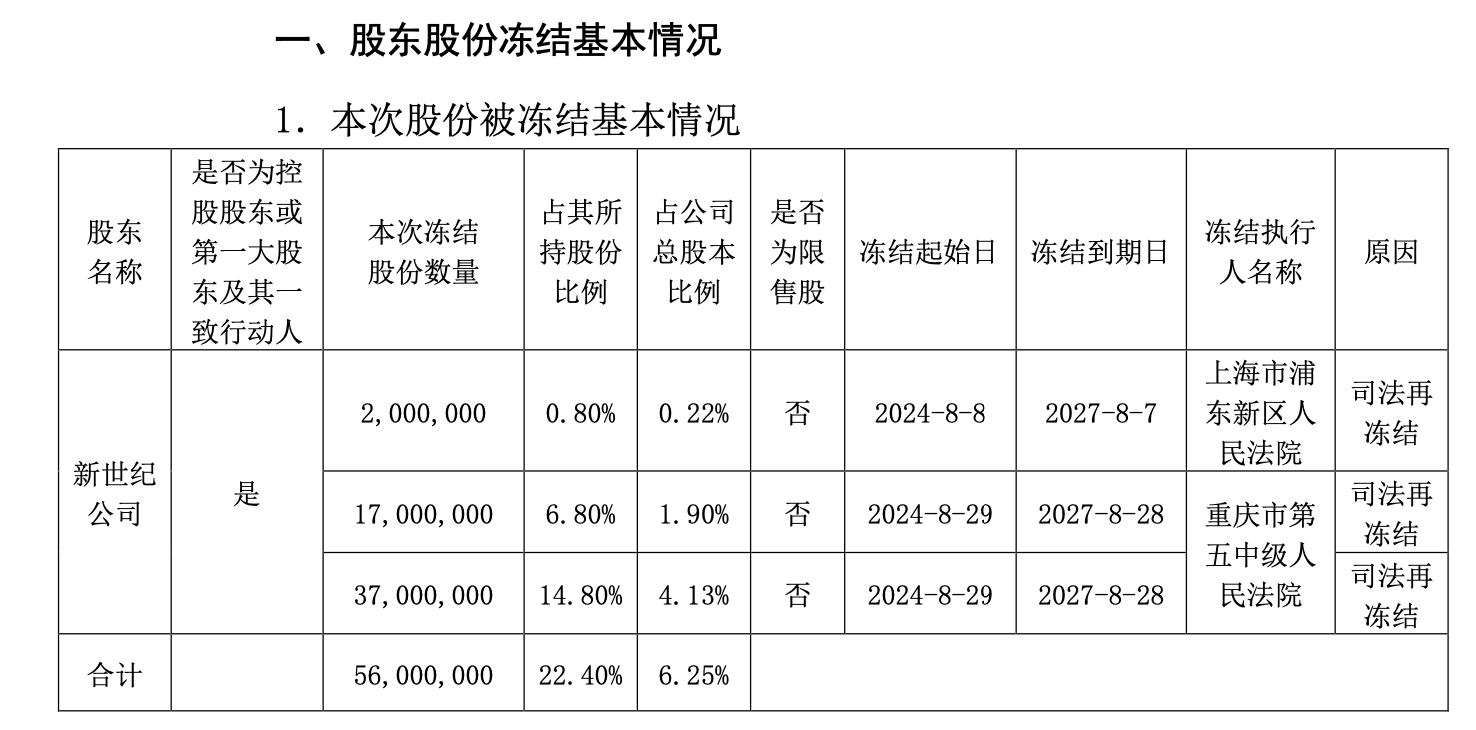截至9月简式权益变动披露,新世纪持有1.76亿股中,近1.71亿股已质押、近6251万股冻结;杨志茂持有3600万股,其中3550万股被质押、3050万股被冻结;朱凤廉持有1.32亿股,其中1.25亿股被质押、7621万股被冻结。