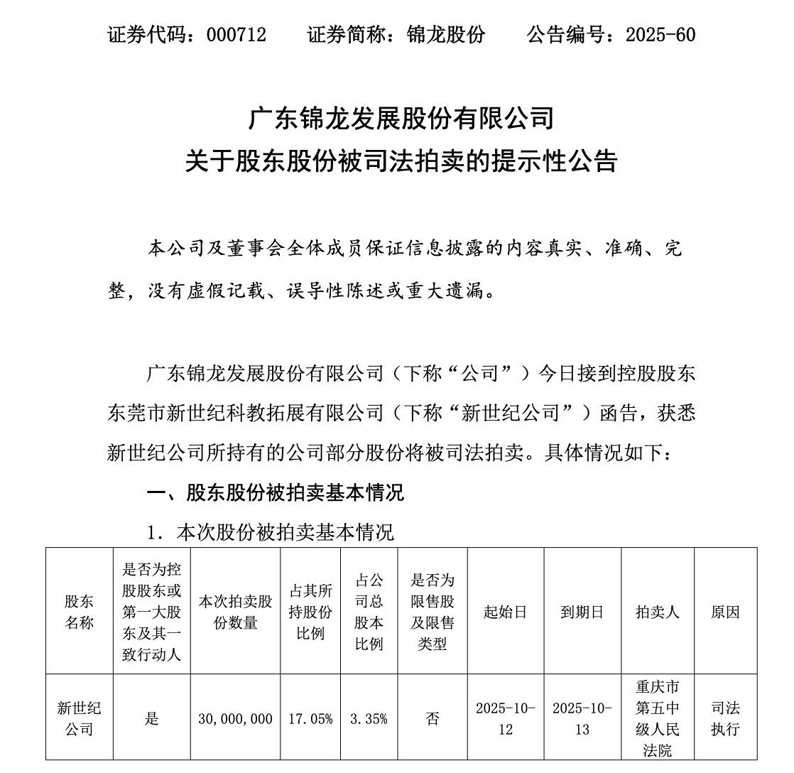 9月12日,锦龙股份(000712)发布公告称,控股股东东莞市新世纪科教拓展有限公司(下称“新世纪公司”)持有的3000万股公司股份将于10月12-13日被重庆市第五中级人民法院司法拍卖;即便全部成交过户,新世纪仍持有1.46亿股(16.29%),控股权与实控人不变;依法过户后的股份6个月内不得交易。