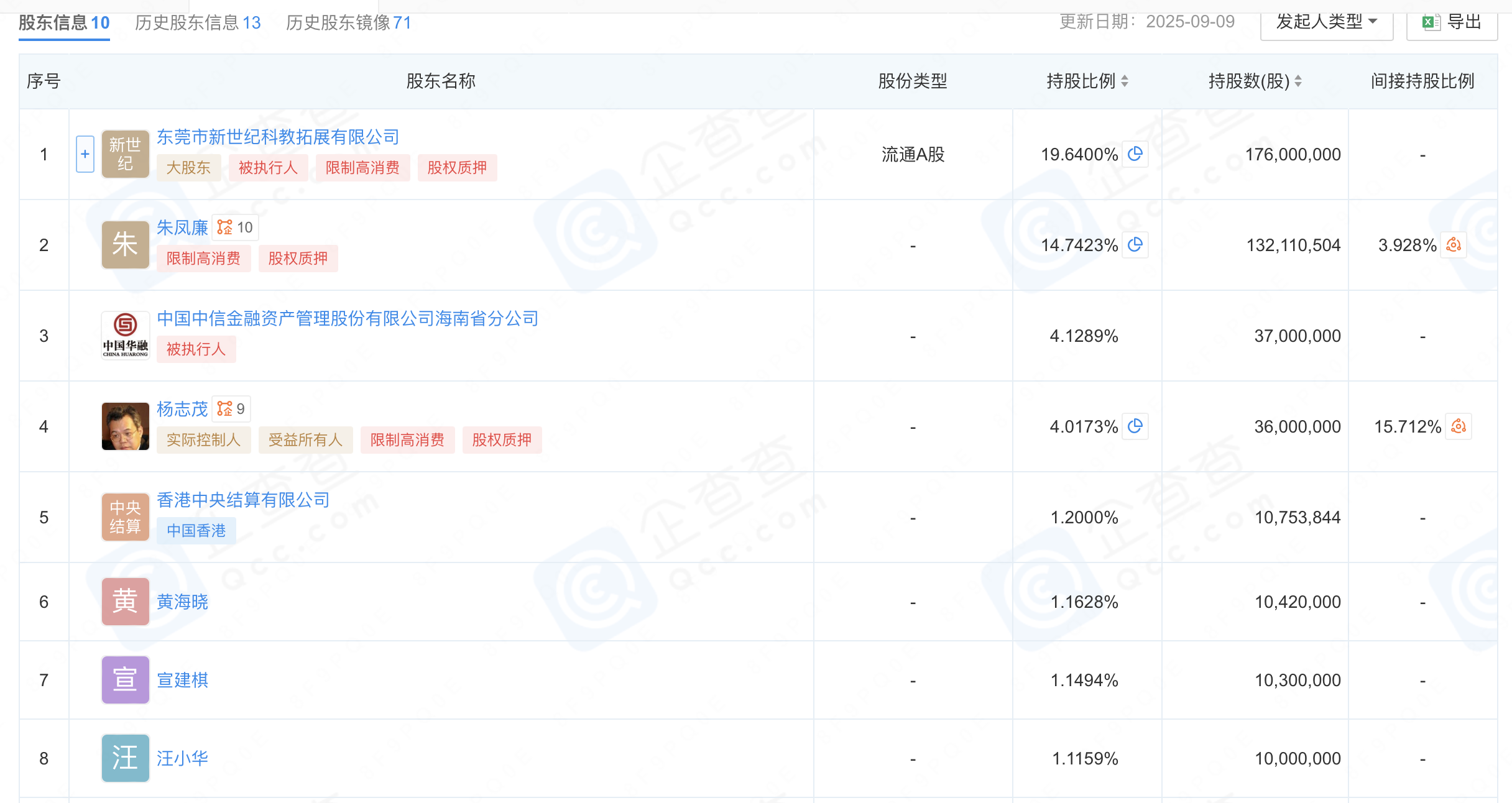 Choice显示,新世纪公司当前为锦龙股份的第一大股东,持股19.64%;实际控制人为杨志茂,其与一致行动人新世纪公司、配偶朱凤廉合计持股38.41%,均存在股权质押的情况。此外,前十大股东还包括中国中信金融资产管理股份有限公司海南省分公司(4.13%)、香港中央结算有限公司(1.20%)及多名自然人。