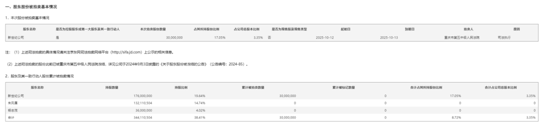 公司表示,若本次拍卖股份最终全部成交并完成过户,新世纪仍为控股股东,杨志茂仍为实际控制人。