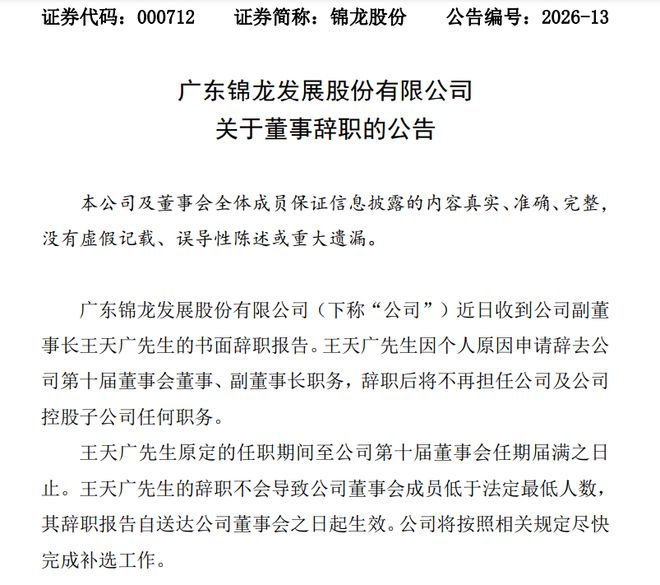 2月2日晚,锦龙股份集中发布多份公告,披露董事会人事调整及资本运作事项。公司副董事长王天广因个人原因辞职,同时董事会审议通过议案,提名公司办公室主任袁圆为第十届董事会非独立董事候选人。