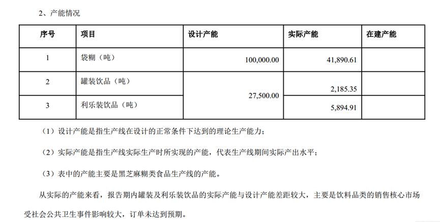 而 2022 年年报显示,黑芝麻的袋糊设计产能为 10 万吨,实际产能为 4.19 万吨,产能利用率不足 42%,没有在建产能;罐装饮品和利乐装饮品合计设计产能为 2.75 万吨,实际产能为 8080.26 吨,产能利用率为 29.38%。