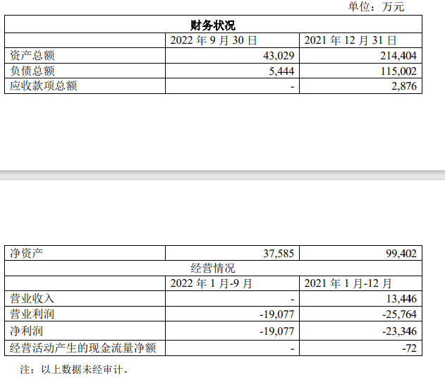 根据公告,天臣新能源2021年亏损2.33亿元,2022年前三季度亏损1.91亿元。截至2022年9月末,天臣新能源净资产由上年末9.94亿元缩水至3.76亿元,负债5444万元。