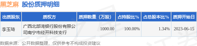黑芝麻(000716)6月17日公开信息显示,股东李玉琦向广西北部湾银行股份有限公司南宁市经开科技支行合计质押1000.0万股,占总股本1.34%。质押详情见下表: