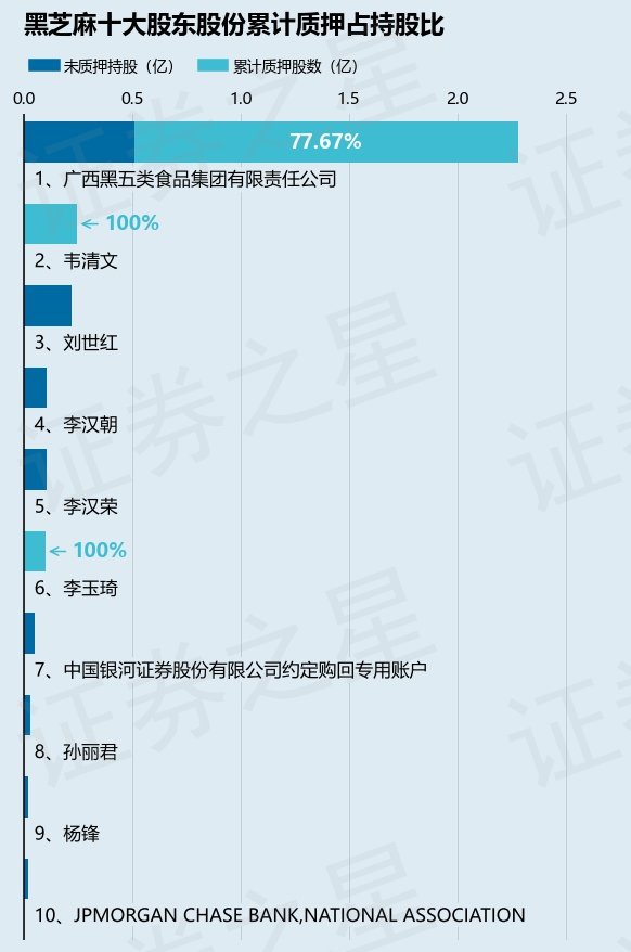 截止本公告日,股东广西黑五类食品集团有限责任公司已累计质押股份1.77亿股,占其持股总数的77.67%,股东韦清文已累计质押股份2482.34万股,占其持股总数的100.0%,股东李玉琦已累计质押股份1000.0万股,占其持股总数的100.0%。本次质押后黑芝麻(000716)十大股东的累计质押股份占持股比例见下图: