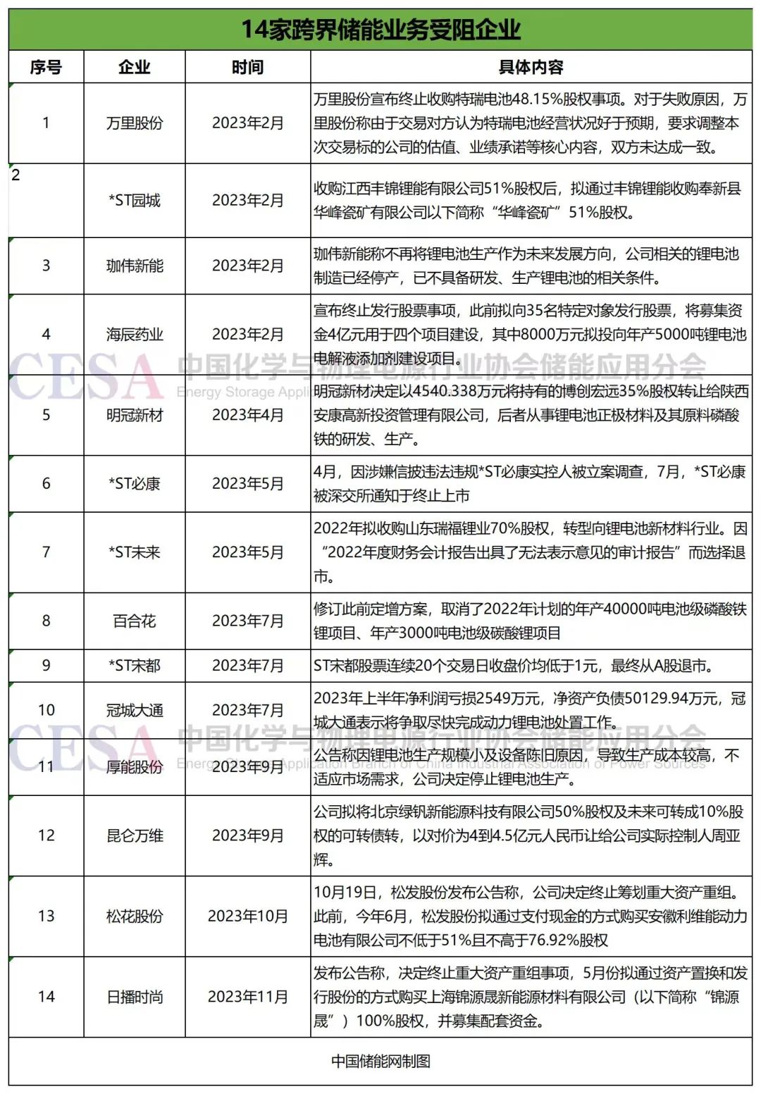 据不完全统计,单是2023年就有14家上市公司跨界储能业务受阻。