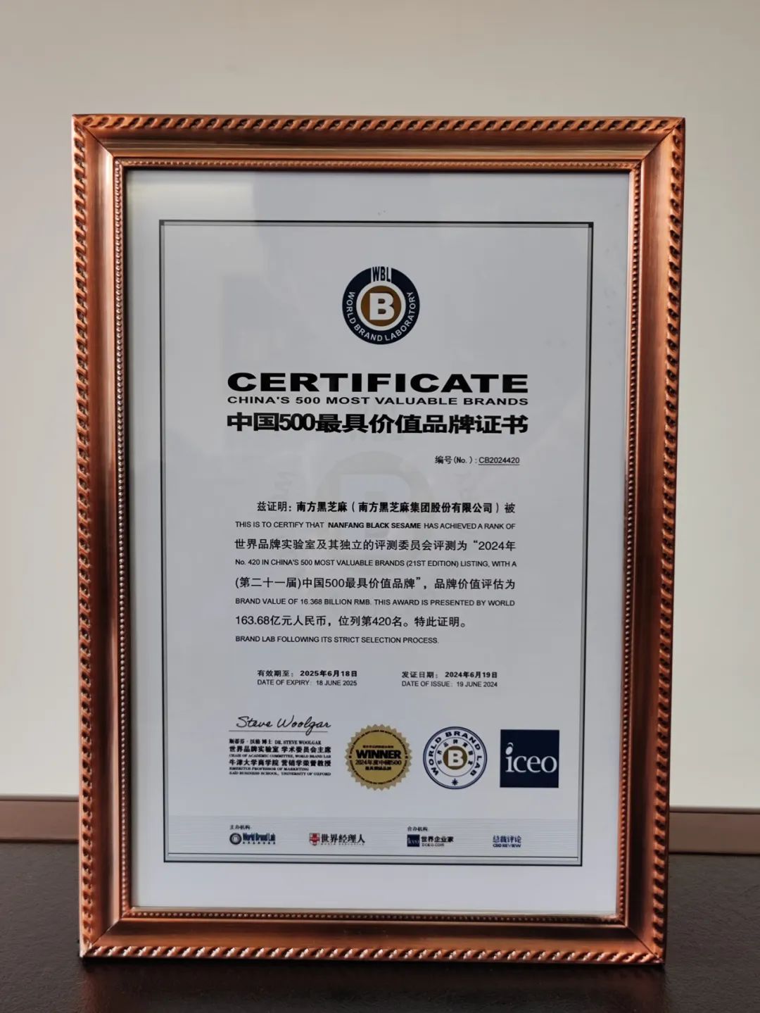 主办方世界品牌实验室(World Brand Lab)发布了2024年《中国500最具价值品牌》分析报告,南方黑芝麻经过初评、专家评审等环节,从入围的众多优秀企业中脱颖而出,以163.68亿元品牌价值荣登榜单第420名!