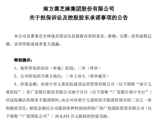 该担保金额纠纷源于2020年。当年,南宁儿童医院因PPP项目建设需要,向广发银行南宁分行申请5.05亿元项目专用贷款,南宁儿童医院的母公司广投国医公司为此提供担保,黑芝麻作为广投国医股东,以持有广投国医公司36.41%股权(对应出资金额为6553万元)为限,为上述借款提供质押担保,但未及时履行审议程序。