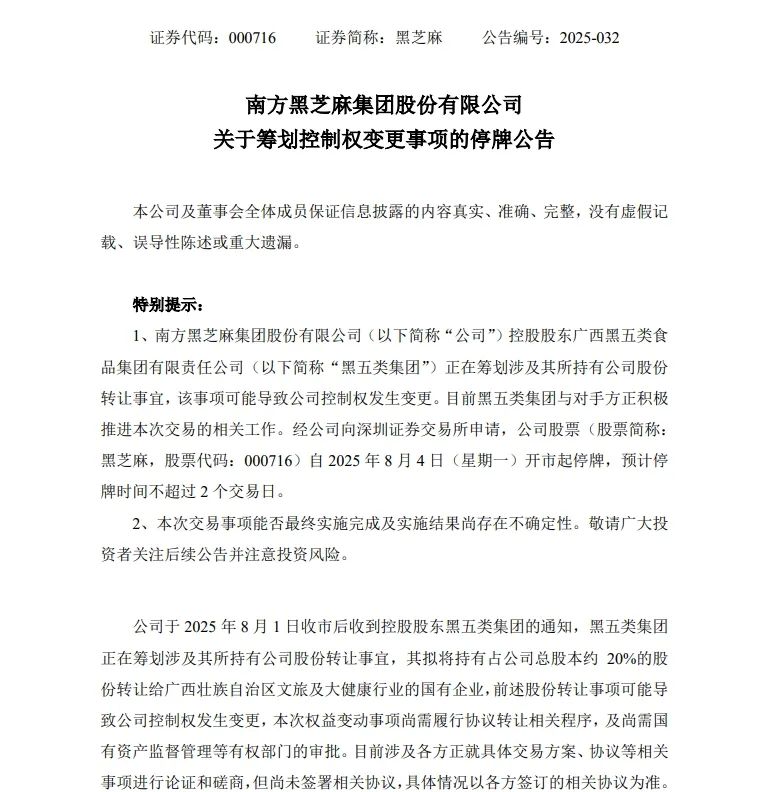 3日晚间,黑芝麻一纸公告表示,拟筹划控制权变更事项,经公司申请于2025年8月4日开市起临时停牌。黑芝麻在公告中提到8月1日盘后受到控股股东黑五类集团正在筹划涉及其所持有公司