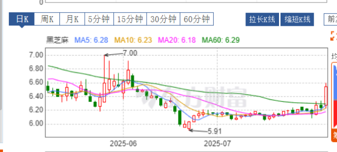 截至8月1日收盘,黑芝麻上涨4.81%,股价报6.54元/股,总市值49.28亿元。