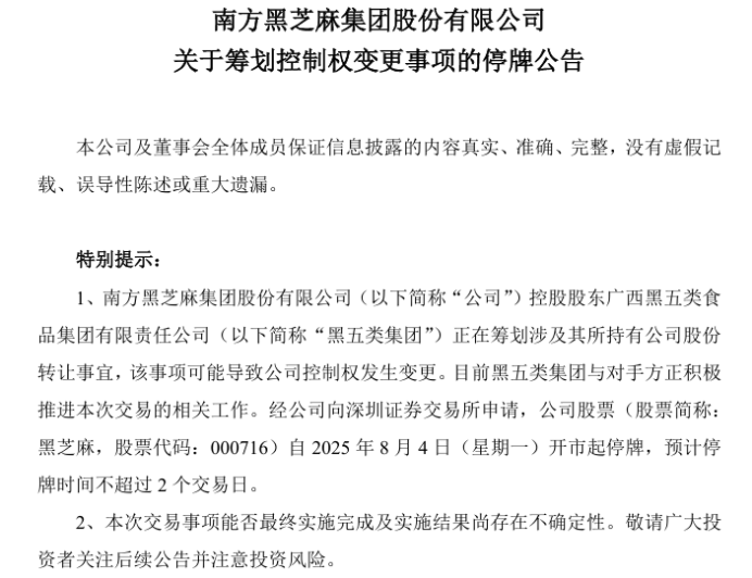 今日午间,南方黑芝麻集团股份有限公司(简称:黑芝麻)公告,公司于8月1日收市后收到控股股东广西黑五类食品集团有限责任公司(简称“黑五类集团”)的通知,黑五类集团正在筹划涉及其所持有公司股份转让事宜,其拟将持有占公司总股本约20%的股份转让给广西壮族自治区文旅及大健康行业的国有企业,前述股份转让事项可能导致公司控制权发生变更。公司股票自8月4日开市起停牌,预计停牌时间不超过2个交易日。