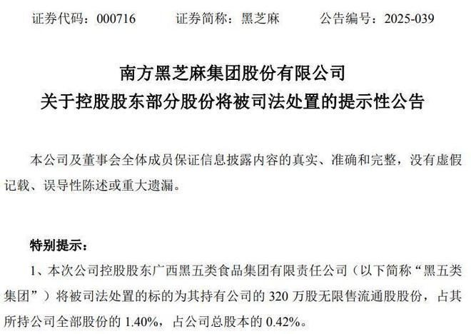 2025年8月27日,黑芝麻(000716.SZ)公告显示,控股股东广西黑五类食品集团有限责任公司(下称“黑五类集团”)所持公司320万股股份将被司法处置,占其所持公司全部股份的1.40%,占公司总股本的0.42%。