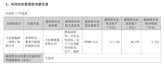 值得注意的是,黑芝麻2022年年报显示,在共同对外投资的关联交易表格中, 天臣新能源 (深圳)有限公司是共同投资方,该公司与黑芝麻的关联关系为,其是黑芝麻重要股东、董事长配偶控制的企业。而被投资企业是 天臣新能源 公司,主营锂电池组件、可充电电池包等,净利润亏损1352万元。而2022年10月,黑芝麻以持有的全资子公司 江西小黑小蜜食品有限责任公司 100%股权作价、不足部分以自有资金补足,合计5亿元对 天臣新能源 增资。增资完成后,黑芝麻持有 天臣新能源 59.09%股权。
