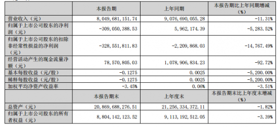 归属于上市公司股东的扣除非经常性损益的净利润-3.29亿元,同比减少14,767.49%;经营活动产生的现金流量净额7857.08万元,同比减少92.72%;基本每股收益亏损0.1275元,加权平均净资产收益率-3.45%。
