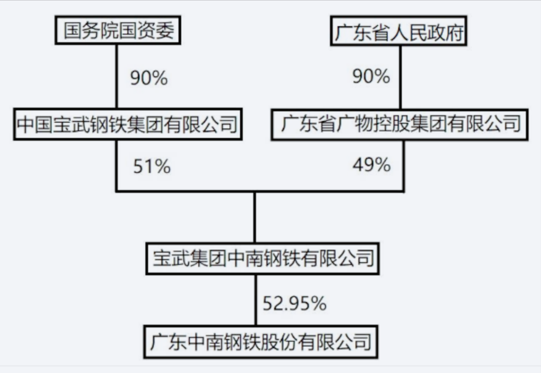中南钢铁正是中南股份的控股股东,间接控股股东则是宝武集团,通过中南钢铁间接控制大约53%股份,实际控制人为国务院国资委,为上市央企;而广东省政府也通过广物控股间接持有中南钢铁49%股份,公司总部位于广东韶关。