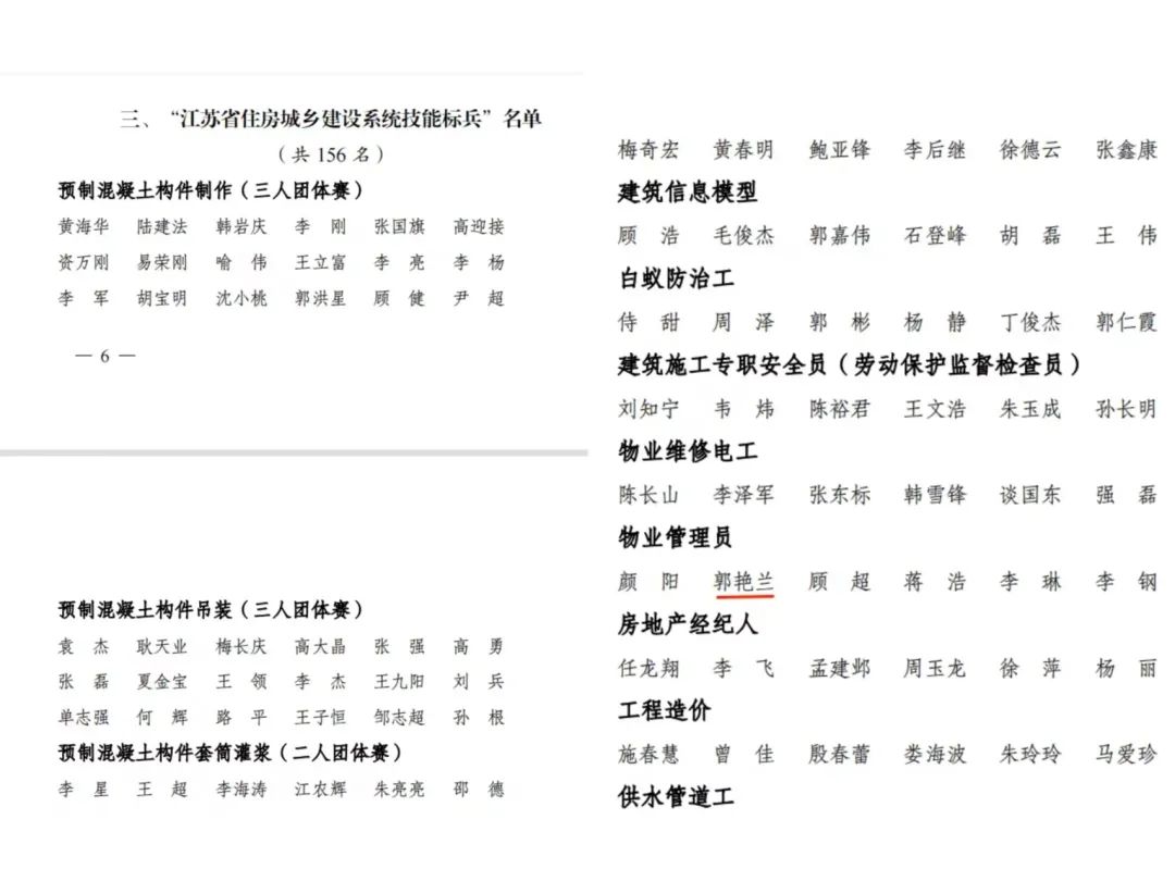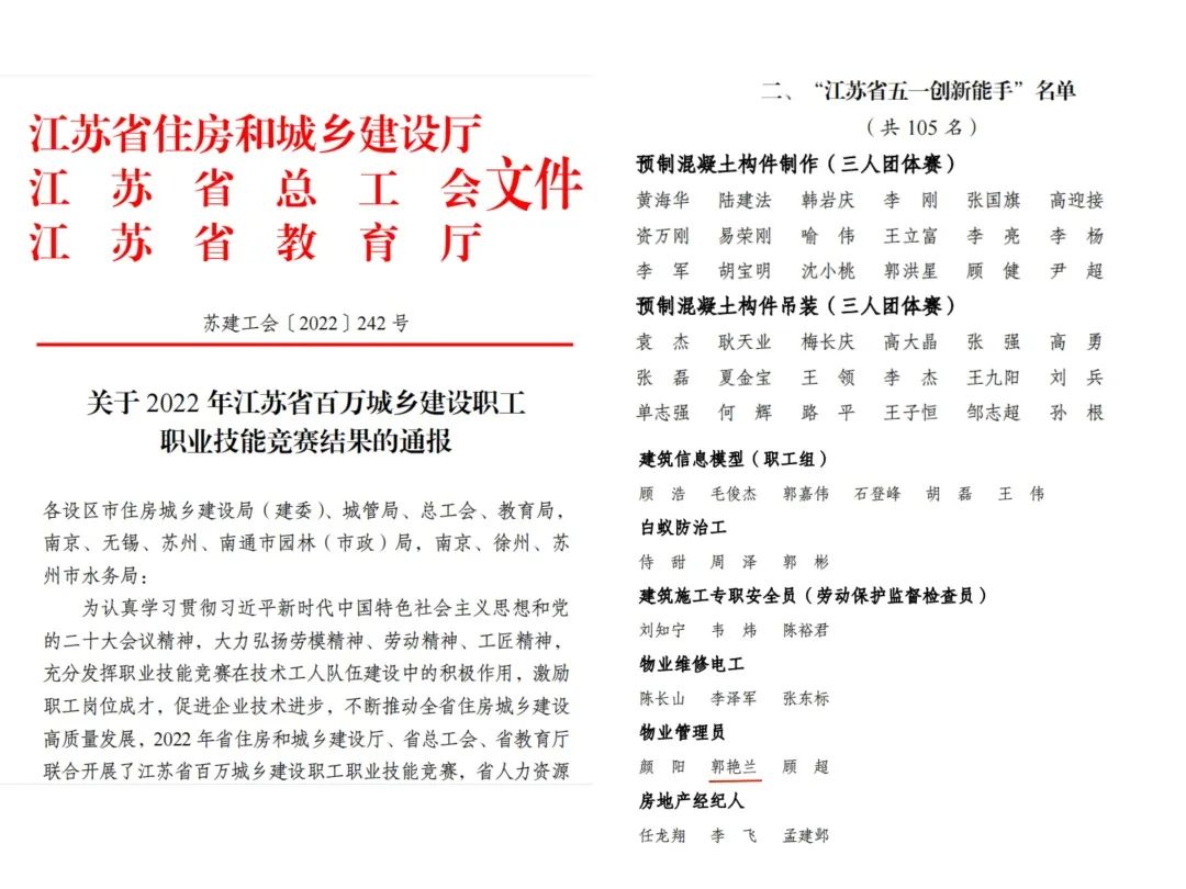 日前,2022 年江苏省百万城乡建设职工职业技能竞赛结果揭晓,苏宁环球集团旗下苏宁物业公司员工郭艳兰荣获“江苏省五一创新能手”、“江苏省住房城乡建设系统技能标兵”称号,梁伟获得“优秀选手”证书。