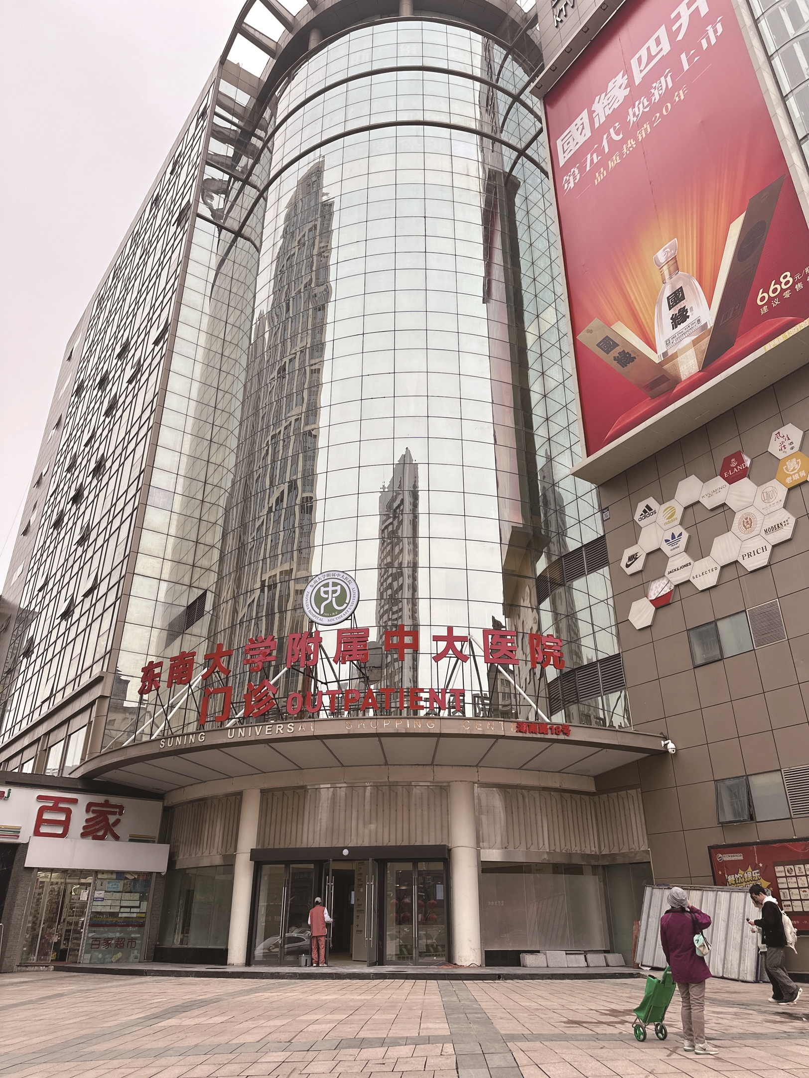 3月24日下午,现代快报记者来到位于南京湖南路的苏宁环球购物中心,这里紧靠着南京曾经的“网红”灯光隧道,对面就是狮子桥步行街,地段优越。然而,“苏宁环球购物中心”店招已经摘下,换成了“东南大学附属中大医院门诊”几个字。