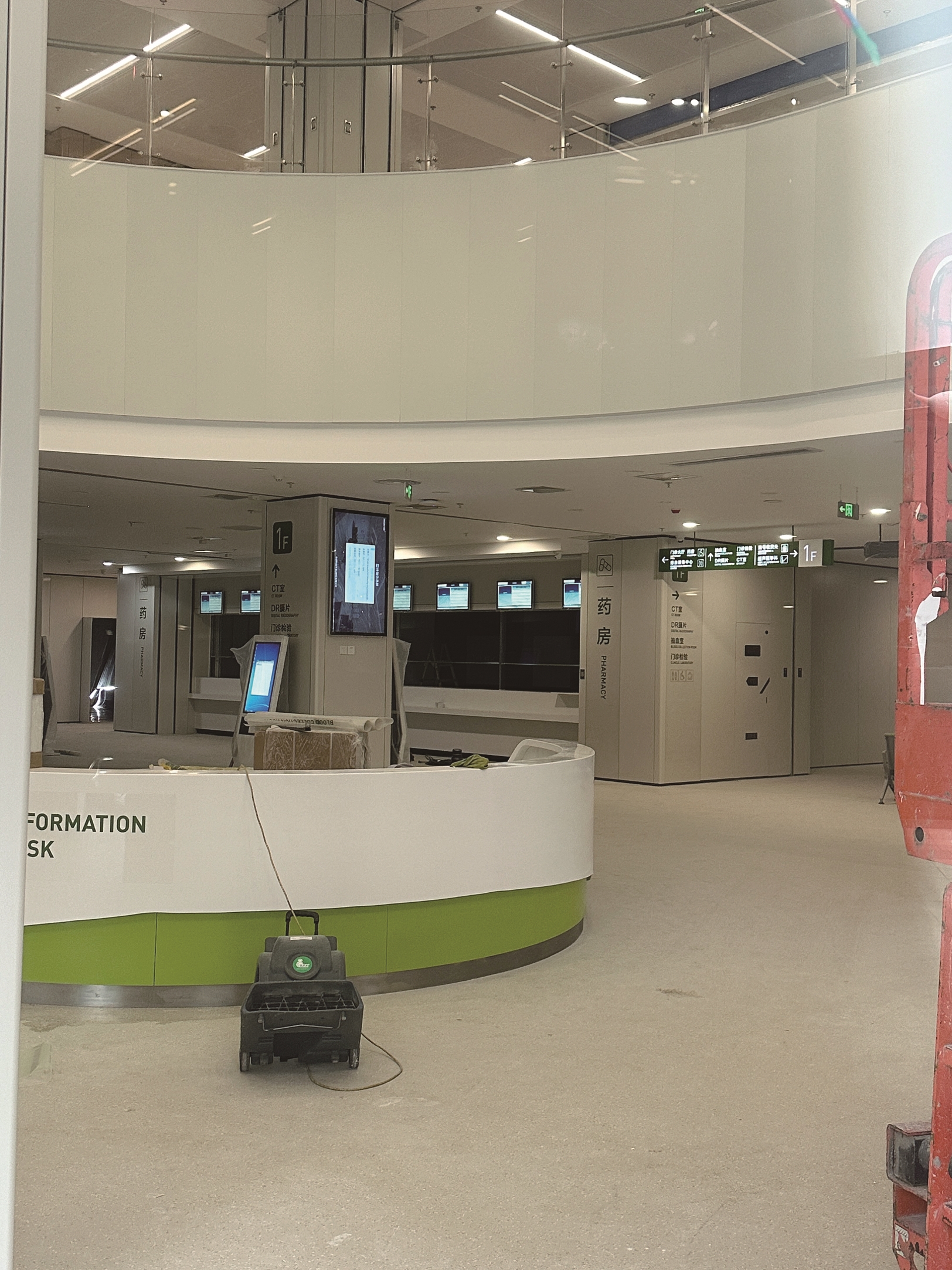 记者看到,大厅已经基本装修完毕,咨询服务台、自助挂号机、指示牌、等候区座椅等都已经放置好。入口处的指示牌标明了内部结构,有门诊大厅、药房、CT室、超声医学科、抽血室、DR摄片等。
