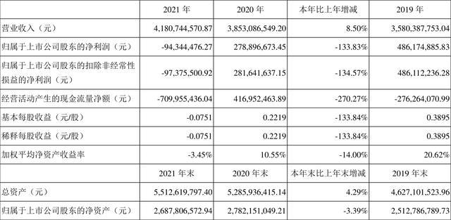 截至2021年末,公司经营活动现金流净额为-7.10亿元,同比减少11.27亿元;筹资活动现金流净额4.14亿元,同比增长509.91%,主要原因是本期银行借款净额增加所致;投资活动现金流净额-1.93亿元,上年同期为-2146.55万元,主要因为本期支付重庆华渝股权投资基金合伙企业(有限合伙)出资款19000万元所致。
