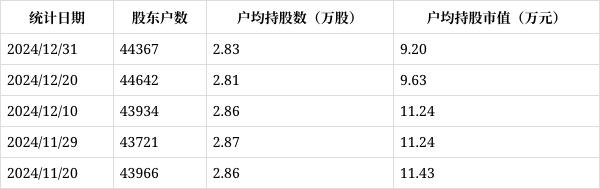 从1月6日公开信息显示,新能泰山截至2024年12月31日公司股东户数为4.44万户,较上期(2024年12月20日)减少275户,降幅为0.62%,变化不大。