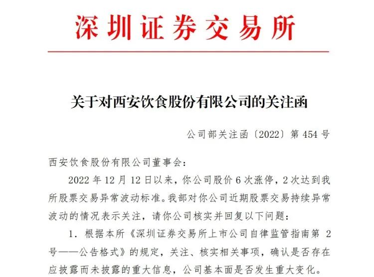 12月21日,深交所向近期以来股价大涨近四倍、21日总市值首破百亿元的牛股西安饮食(000721)下发关注函,要求其核查确认是否存在应披露而未披露的重大信息,公司基本面是否发生重大变化;说明股东及实际控制人是否计划对公司进行股权转让、资产重组以及其他对公司有重大影响的事项,并要求其书面回复;核查公司董事、监事、高级管理人员及其直系亲属是否存在买卖公司股票的行为,是否存在涉嫌内幕交易的情形。