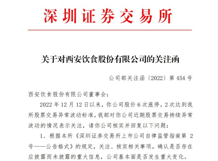 12月21日,深交所向近期大涨三倍、21日总市值首破百亿元的牛股西安饮食(000721)下发关注函,要求其核查确认是否存在应披露而未披露的重大信息,公司基本面是否发生重大变化。说明股东及实际控制人是否计划对公司进行股权转让、资产重组以及其他对公司有重大影响的事项,并要求其书面回复。核查公司董事、监事、高级管理人员及其直系亲属是否存在买卖公司股票的行为,是否存在涉嫌内幕交易的情形。