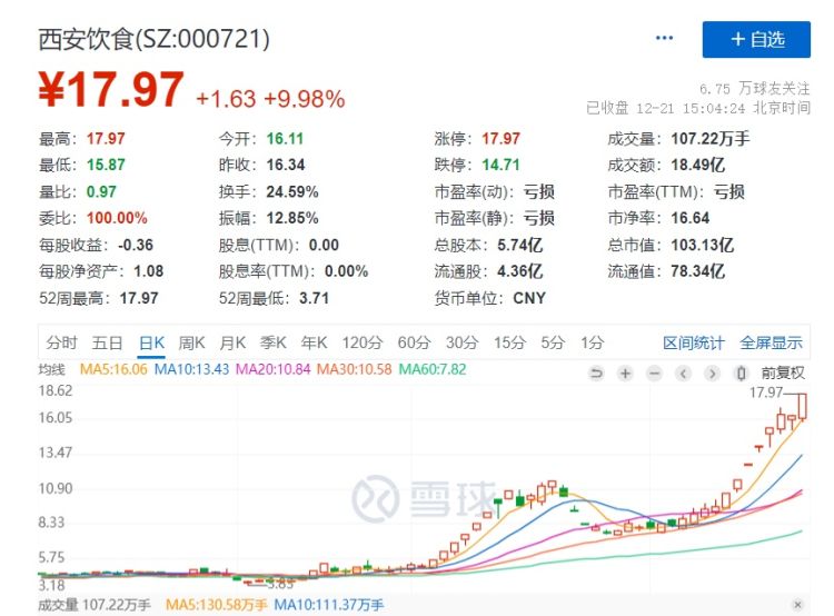截至21日收盘,西安饮食再度涨停,报17.97元,股价再创新高的同时,公司总市值也首次突破百亿元!自10月以来,西安饮食人气持续高涨,8个交易日内录得6个涨停,在近两个月(46个交易日)累计共上涨304.73%。