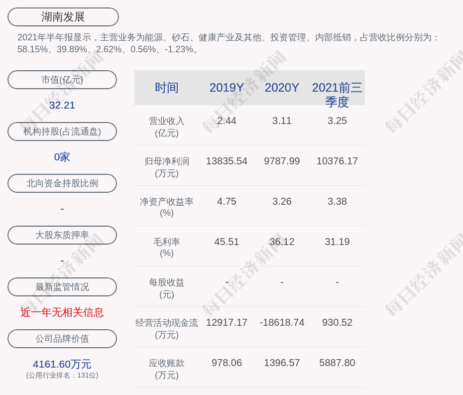 2021年半年报显示,湖南发展的主营业务为能源、砂石、健康产业及其他、投资管理、内部抵销,占营收比例分别为:58.15%、39.89%、2.62%、0.56%、-1.23%。