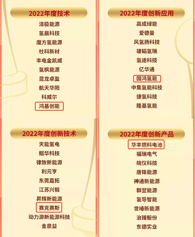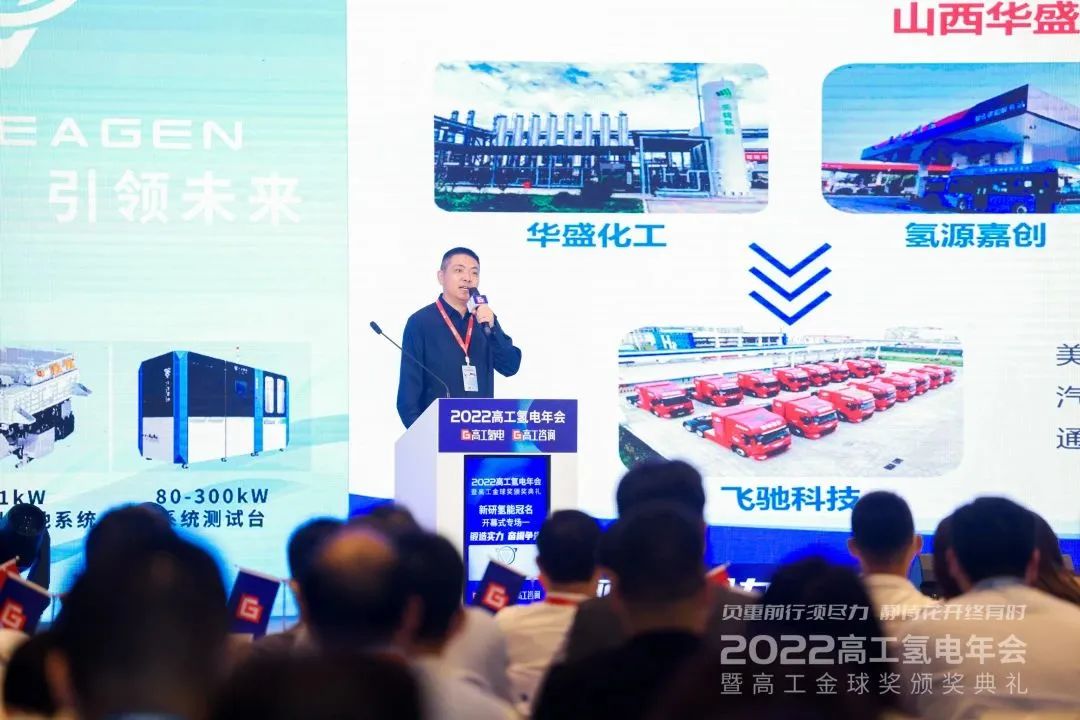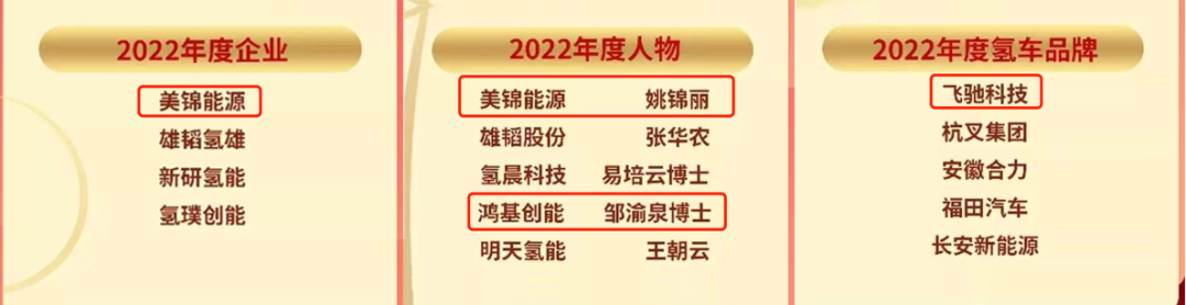 2022高工氢电年会的另一重头戏——金球奖颁奖典礼在闭幕当天举行,重磅揭晓了“2022年度企业”、“2022年度人物”、“2022年度技术”、“2022年度产品”、“2022年度创新应用”、“2022年度创新技术”、“2022年度创新产品”、“2022年度投资价值企业”、“2022年度快速成长企业”、“2022年度氢车品牌”等10大奖项。高工氢电认为这些优秀企业产品、技术、品牌,以标杆的力量走在时代前沿,激发氢电产业向前发展。几乎每一个奖项中都出现美锦氢能产业盟友的身影,大家作为各个细分领域高成长性企业,既是产业同盟的骄傲所在,也是国内外氢能领域的希望之光。姚总及鸿基创能CEO邹渝泉博士当晚同时上榜年度人物,以两位近年来为企业发展以及为国内氢能行业发展所作出的努力与贡献,可谓实至名归。