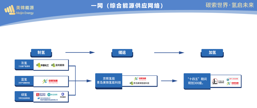 “一网”指综合能源供应网络。在制氢端,美锦能源旗下公司有华盛化工、滦州美锦(灰氢),以及京辉氢能(蓝氢),同时与国家能源集团旗下的国华投资、京能集团等联合打造风光氢储一体化的项目(绿氢);储运端旗下公司有环宇京辉,是北京市唯一一家集产氢、储氢、运氢、加氢于一体的氢能源气体上游完整产业链企业;加氢端,美锦能源“十四五”期间规划建设300座加氢站。