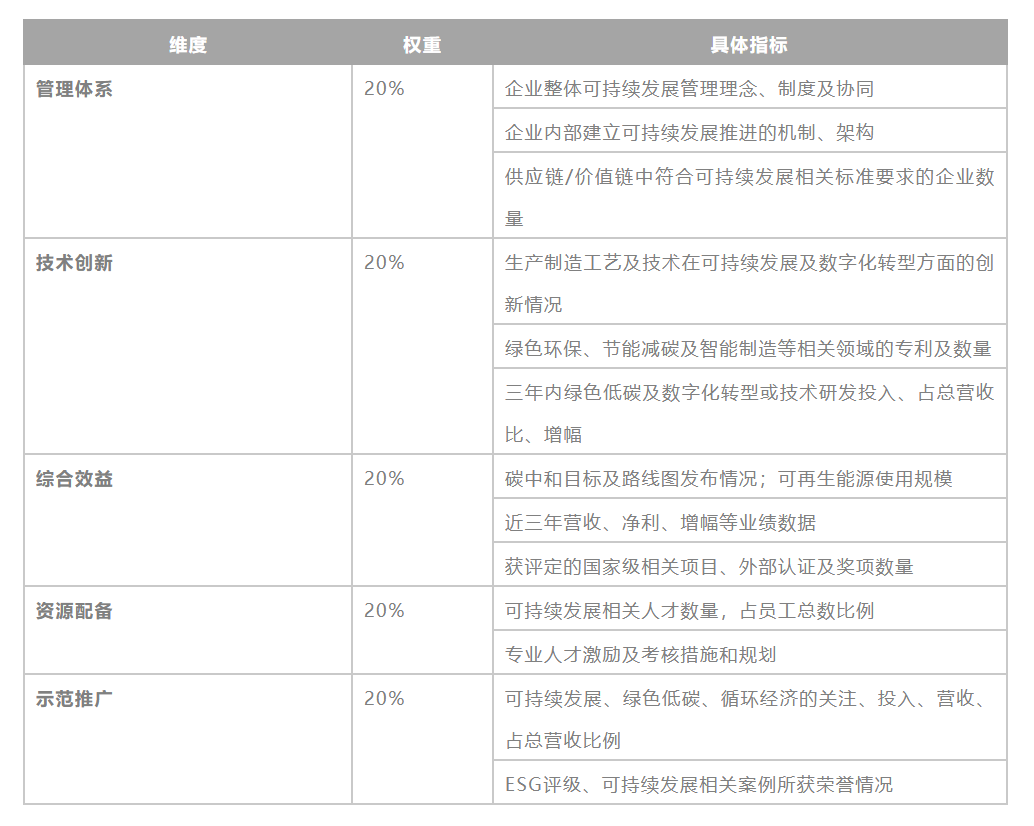 福布斯方面表示,为了打造可持续发展领域具有公信力和权威性的评选,福布斯中国特邀中国能源研究会常务理事李俊峰、中国农机工业协会风力机械分会常务副会长兼秘书长祁和生、清华大学四川能源互联网研究院副院长刘毅、TUV莱茵大中华区可持续发展服务总经理许秋明为评选指标完善提出了专业的建议。本次评选围绕“管理体系、技术创新、综合效益、资源配备、示范推广”五大维度,并根据维度下的细化指标进行逐一评定,最终由评委会评选出年度可持续发展工业企业的先驱典范。