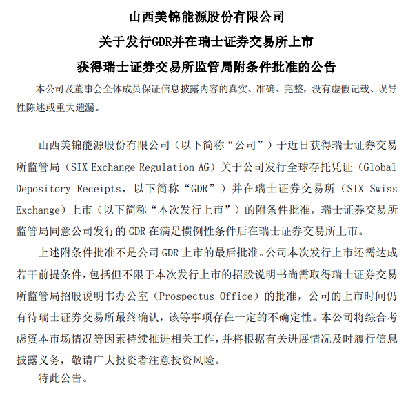 据了解,2022年10月20日,美锦能源曾发布公告:为了加速推进山西美锦能源股份有限公司(以下简称“公司”)由传统能源向氢能源转型升级的发展战略,拓宽公司国际融资渠道,公司筹划境外发行全球存托凭证(Global Depository Receipts,“GDR”)并在瑞士证券交易所上市。