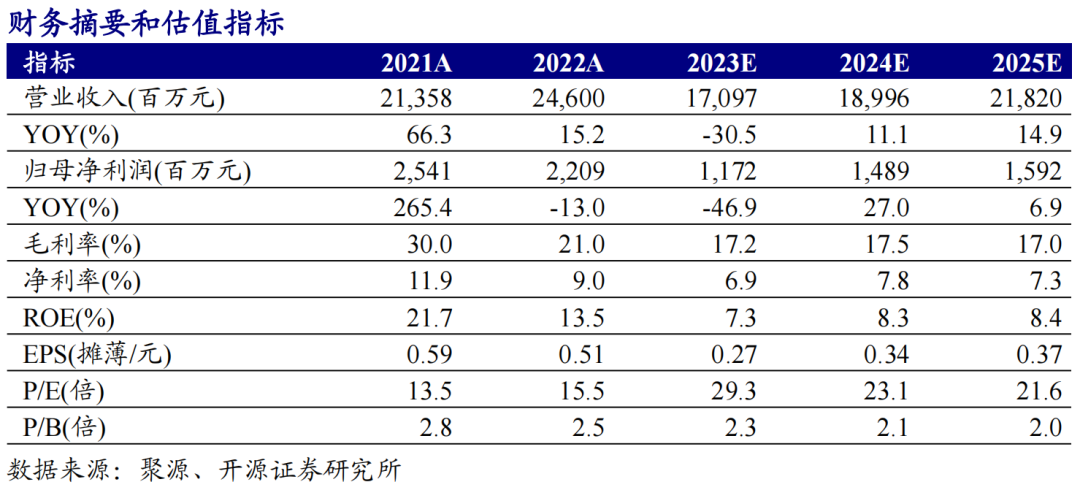 公司发布半年报,2023H1公司实现营业收入97.39亿元,同比-27.07%;实现归母净利润3.73亿元,同比-72.55%;单Q2来看,公司实现营业收入44.01亿元,同比-38.64%,环比-17.55%;实现归母净利润-0.29亿元,同比-104.29%。考虑到2023年上半年焦化产品价格下行较为明显,公司业绩承压。我们下调2023-2025年盈利预测,预计2023-2025年归母净利润11.7/14.9/15.9亿元(前值27.2/31.2/34.9亿元),同比-46.9%/+27.0%/+6.9%;EPS为0.27/0.34/0.37元;对应当前股价PE为29.3/23.1/21.6倍。随着稳经济政策逐渐落地,焦钢需求有望提升,焦炭利润有望修复,但考虑到公司Q2业绩转负,修复力度有待验证。下调至“增持”评级。