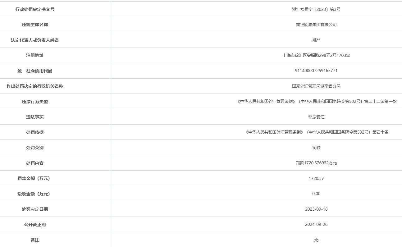 外汇局网站近日公布的行政处罚决定书(湘汇检罚字〔2023〕第3号)显示,美锦能源集团有限公司非法套汇。国家外汇管理局湖南省分局依据《中华人民共和国外汇管理条例》(中华人民共和国国务院令第532号)第四十条,对其罚款1720.576932万元。