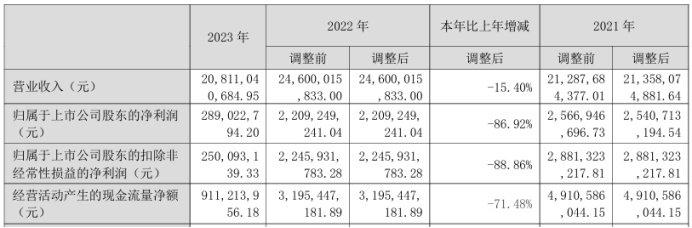 据挖贝网2024年4月28日报道,美锦能源2023年度实现营业收入20,811,040,684.95元,同比下滑15.40%;归属于上市公司股东的净利润289,022,794.20元,同比下滑86.92%。
