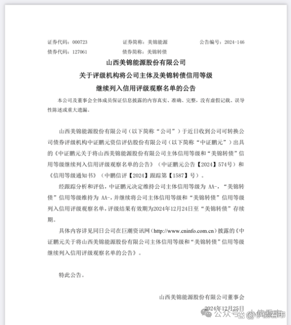 12月25日,美锦能源(000723.SZ)公告称,中证鹏元维持公司主体信用等级为AA-,“美锦转债”信用等级维持为AA-,并继续将公司主体信用等级和“美锦转债”信用等级列入信用评级观察名单。