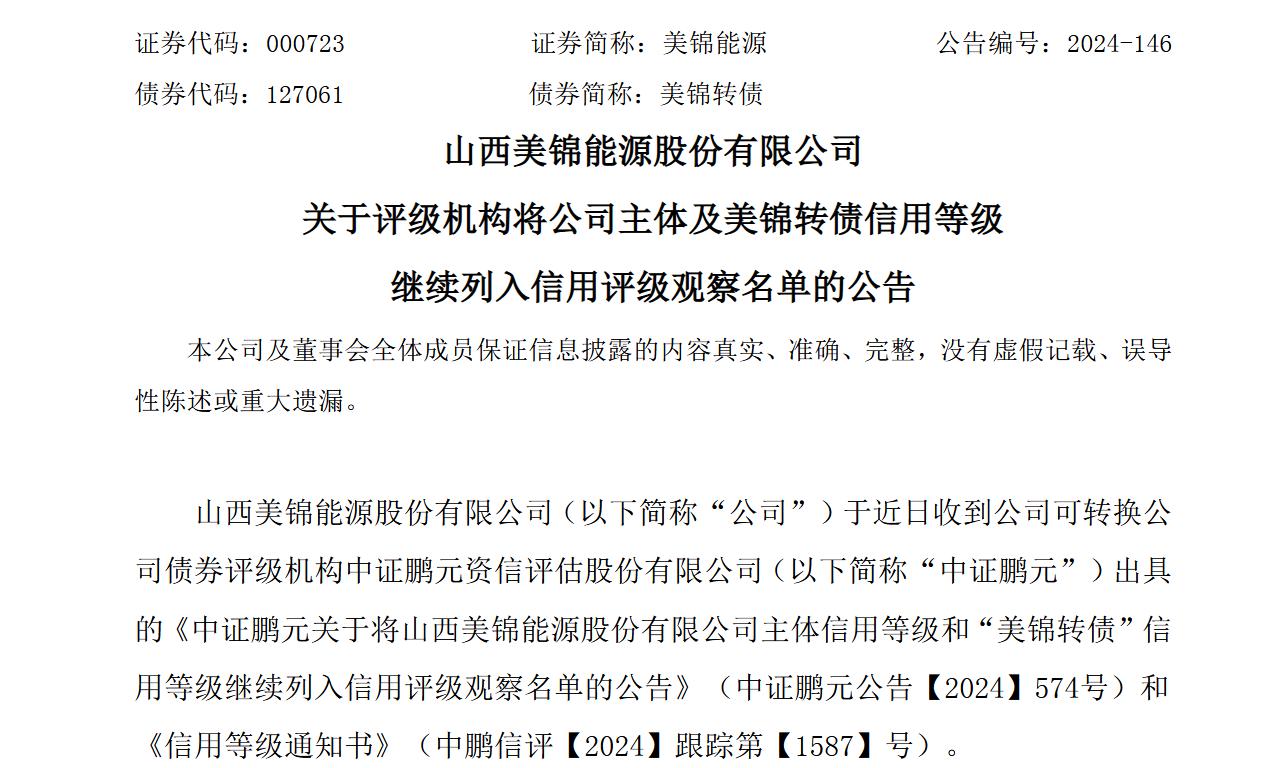 近日,山西美锦能源股份有限公司(以下简称“美锦能源”)发布公告称,中证鹏元维持公司主体信用等级及“美锦转债”信用等级为AA-,并继续将其列入信用评级观察名单。这已是中证鹏元自今年6月以来,第二次将美锦能源列入观察名单。