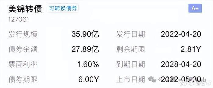 《小债看市》统计,目前美锦能源仅存续“美锦转债”,发行于2022年4月,发行规模35.9亿元,当前余额27.89亿元。