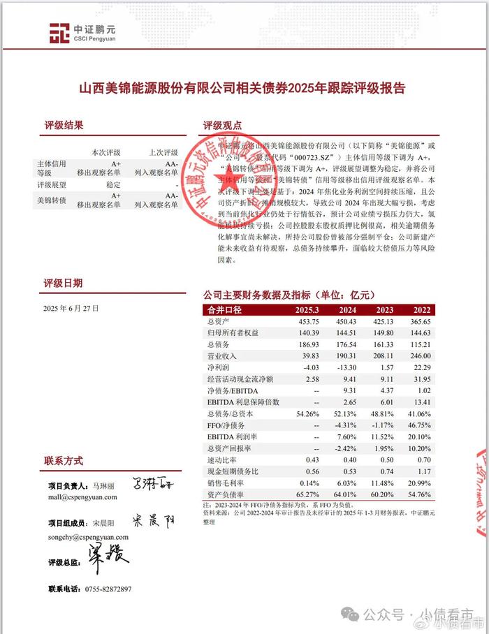 近日,中证鹏元公告称,将美锦能源(000723.SZ)主体信用等级下调为A+,“美锦转债”信用等级下调为A+,评级展望调整为稳定,并将公司主体信用等级和“美锦转债”信用等级移出信用评级观察名单。