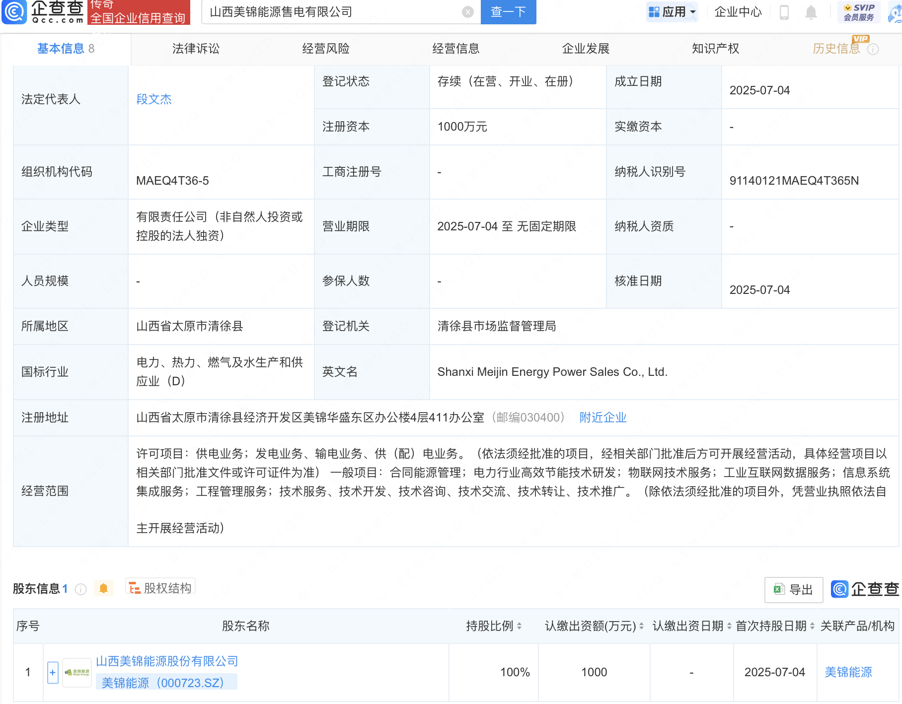 近日,山西美锦能源售电有限公司成立,法定代表人为段文杰,经营范围包含:合同能源管理;电力行业高效节能技术研发;物联网技术服务;工业互联网数据服务等。股权穿透显示,该公司由美锦能源(000723)全资持股。