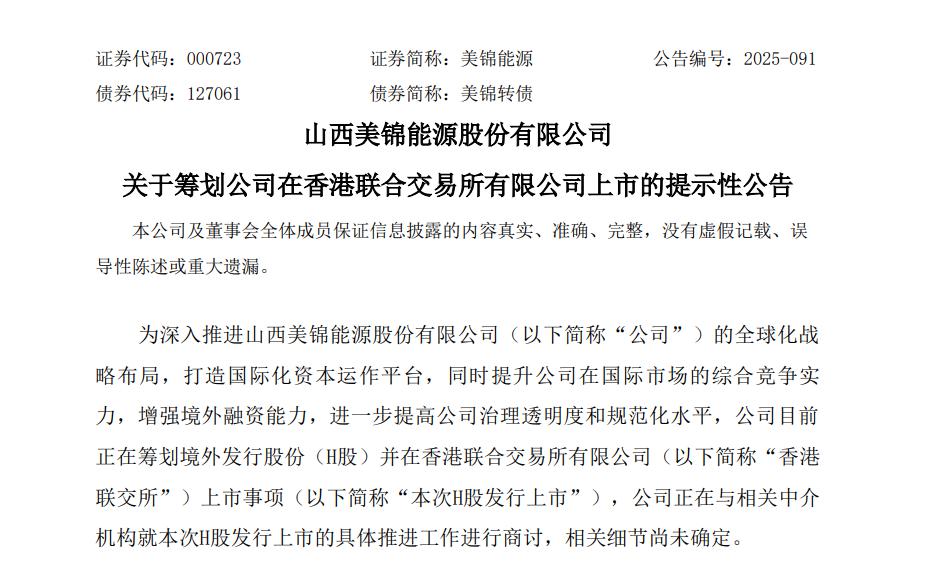 8 月 15 日,美锦能源(000723)发布公告称,为深入推进公司全球化战略布局,打造国际化资本运作平台,同时提升在国际市场的综合竞争实力,增强境外融资能力,进一步提高公司治理透明度和规范化水平,公司目前正在筹划境外发行股份(H 股)并在香港联交所上市事项,正在与相关中介机构就本次 H 股发行上市的具体推进工作进行商讨,相关细节尚未确定。