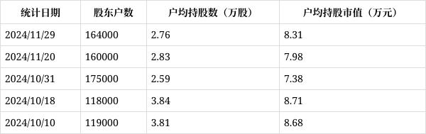 从12月3日公开信息显示,冠捷科技截至2024年11月29日公司股东户数为16.40万户,较上期(2024年11月20日)增加4000户,增幅为2.50%,变化不大。